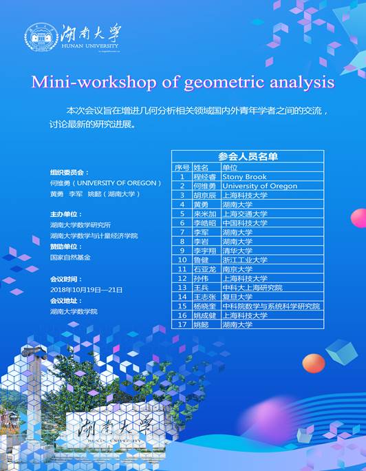 为了增进几何分析相关领域国内外青年学者之间的交流,研讨最新进展,新葡萄8883官网AMG数学与计量经济学院、新葡萄8883官网AMG数学所拟于2018年10月19-21日(19日报到)在新葡萄8883官网AMG召开“Mini-workshop of geometric analysis”。会议拟邀请国内外高校院所几何分析相关问题的青年学者参会。本次会议由湖南大学数学与计量经济学院举办,受国家自然基金项目和新葡萄8883官网AMG数学所资助;另外本次会议不收取会务费,食宿统一安排,我们将按照学校会议规定为邀请嘉宾安排工作用餐,其它费用自理。
