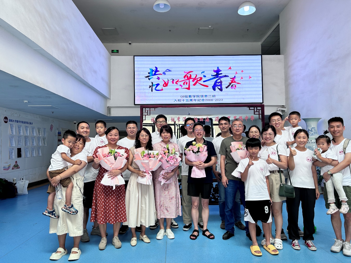 8月19日至20日周末,信息与计算科学2008级2班的同学回到母校举行了入学15周年的“共忆如歌青春”聚会活动。去年他们原本商量好组织毕业十周年纪念活动,因为疫情原因而未能成行。19日下午,他们来到新葡萄8883官网AMG425会议室,与老师们一起欢聚一堂,座谈交流,回忆大学的学习和生活,副院长雷渊以及宋怀玲、罗汉、朱郁森、姚兰、蔡明杰等当年的任课老师应邀出席了座谈会,425还开通了视频会议,在深圳出差和在国外不能前来的校友,也在线上参加了座谈。