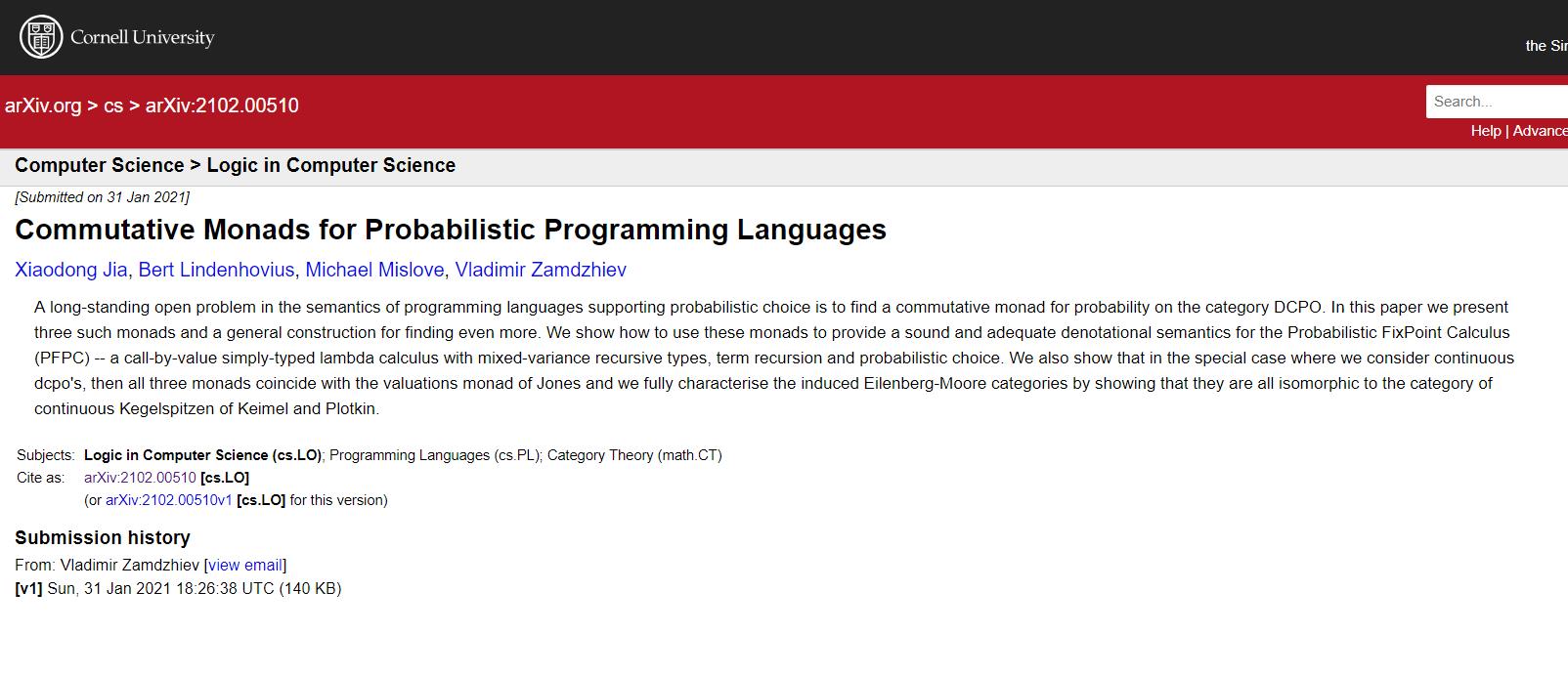 日前,新葡萄8883官网AMG的贾晓东博士(第一作者)与合作者的论文“Commutative Monads for Probabilistic Programming Languages”在LICS2021发表。LICS(ACM/IEEE计算机科学逻辑国际会议,ACM/IEEE Symposium on Logic in Computer Science)是理论计算机科学领域最顶级的国际会议之一,成果代表着理论计算机科学的前沿,自1986年在剑桥大学首次举办至2020年,共计有9篇签署国内第一单位的论文在LICS发表。2021年,共3篇签署国内第一单位的论文被LICS接受,分别是中国科学院、复旦大学和新葡萄8883官网AMG。