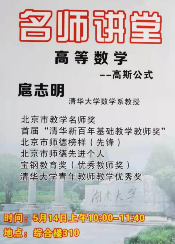 5月14日上午,《名师讲堂》(第1期)活动邀请到清华大学扈志明教授在新葡萄8883官网AMG综合楼310室为材料科学与工程学院大一年级150名学生讲授《高等数学A(2)——高斯公式》。
