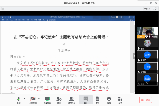 本次主题党日活动采用线上会议形式开展,主题与支部所在系教学工作紧密结合,形式新颖、主题鲜明,支部党员积极主动参与进来,进一步夯实了理论基础,坚定理想信念,立足本职岗位,以实际行动践行育人初心使命。